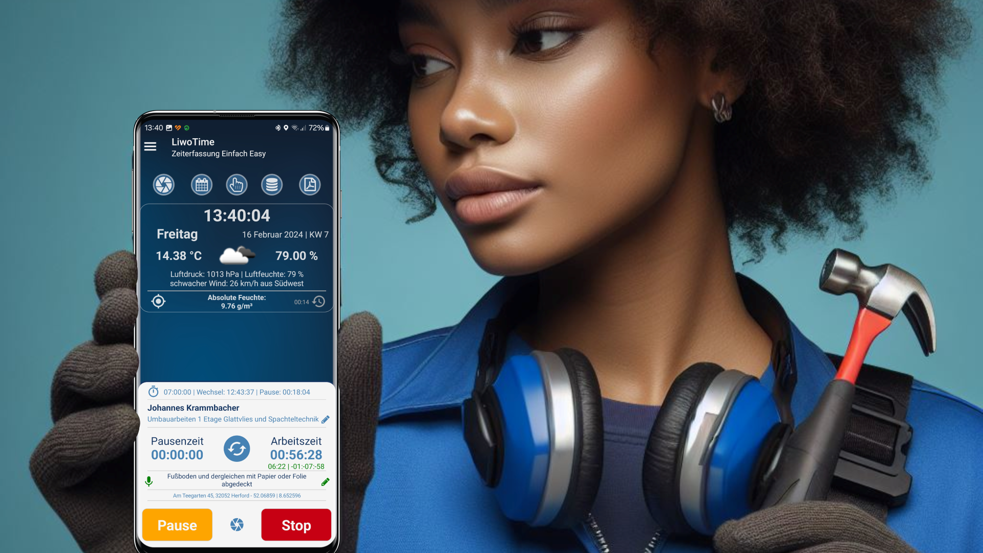 Durch drücken auf den Pause Button wird die Arbeitszeit gestoppt und die Pausenzeit aufgezeichnet.